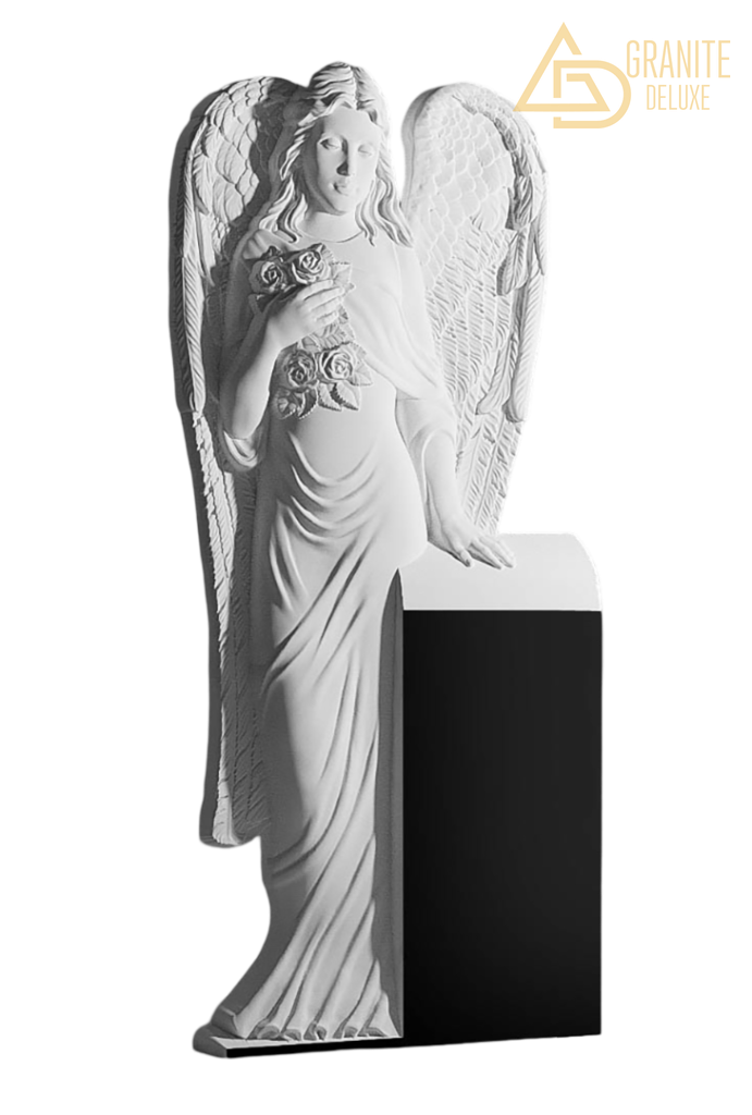 На этом вертикальном памятнике лежит рука ангела с большими, мягко распростёртыми крыльями. В другой своей руке ангел держит резной букет роз. Крылья, охватывающие или касающиеся камня, символизируют защиту и небесное покровительство, а розы в руке — любовь, память и светлую дань ушедшему. Образ передаёт не скорбь, а заботливое приношение: ангел словно возлагает цветы от имени тех, кто помнит, или принёс их из вечности как знак принятия души. Деталь — рука, лежащая на памятнике, — добавляет моменту тактильной близости и личной связи. Памятник создаёт пространство для тёплого, почти личного общения с памятью, где можно почтить близкого, чувствуя, что любовь к нему передана в надёжные, нежные руки.