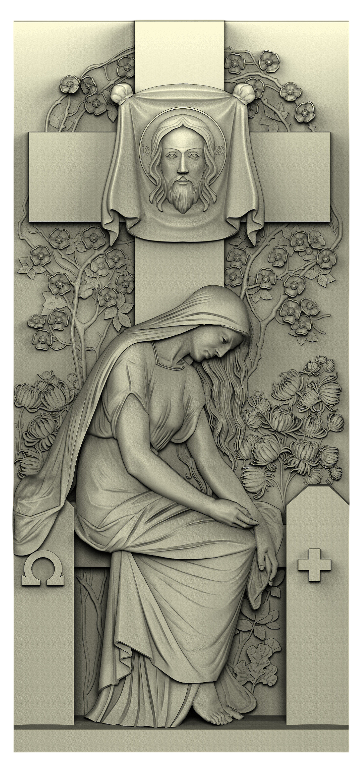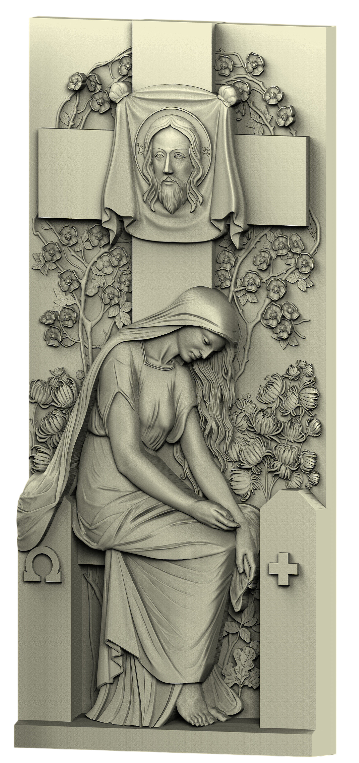 Этот вертикальный памятник сочетает глубокую духовную символику: на нём изображён крест с ликом Иисуса Христа, а у основания крестной оси расположена резная фигура Богоматери, символизирующая защиту, утешение и вечную память о близких. Гармоничные линии и тщательно проработанные детали придают монументу торжественность и величие, отражая любовь и скорбь семьи. Элегантный дизайн создаёт ощущение умиротворения и благородства, подчёркивая утонченную выразительность памятника. Высококачественный материал обеспечивает долговечность и сохранение первозданного вида на многие годы. Этот памятник станет достойным местом для вечного почтения и размышлений о родных.
