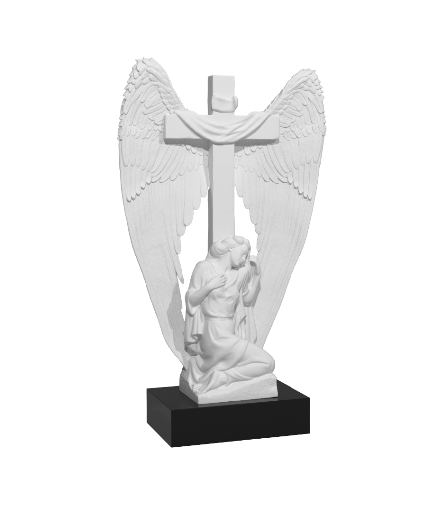 Памятник, где скульптура коленопреклоненного ангела, выполненная в матовой фактуре, воплощает тихую скорбь и молитвенное обращение. Над ним парит крылатый крест — монументальный символ защиты и небесного покровительства, создавая возвышенный и целостный образ. Матовая гладкость обеих деталей придает композиции благородную сдержанность. Вся конструкция установлена на основательное полированное основание. Дизайн передаёт глубину веры, силу духовной поддержки и вечный покой, образуя торжественное и умиротворённое пространство для памяти.