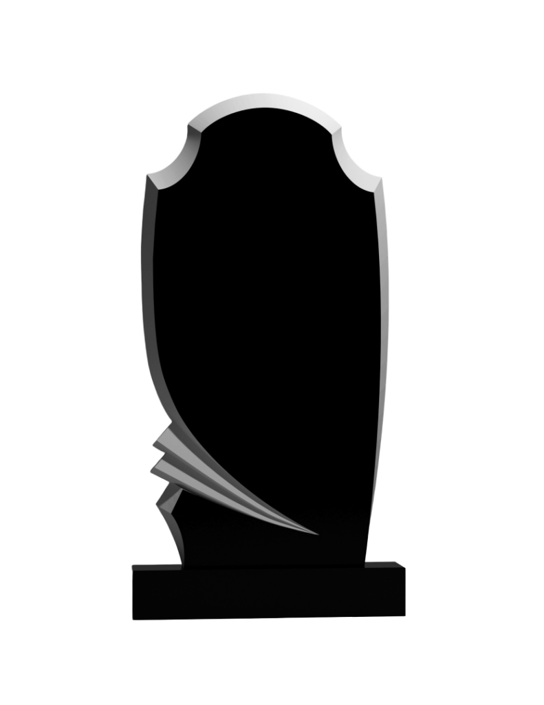 Вертикальный памятник с современным дизайном. Верх стелы имеет плавный арочный изгиб с фигурными краями. Центральная часть гладкая, предназначена для портрета и надписей. Внизу справа расположен резной элемент из изогнутых линий, напоминающий мягкое крыло или завиток. Эта деталь придает памятнику оригинальность и динамику. Конструкция установлена на устойчивое прямоугольное основание. Простой, но выразительный дизайн с необычной резьбой создает достойное и запоминающееся место для памяти.