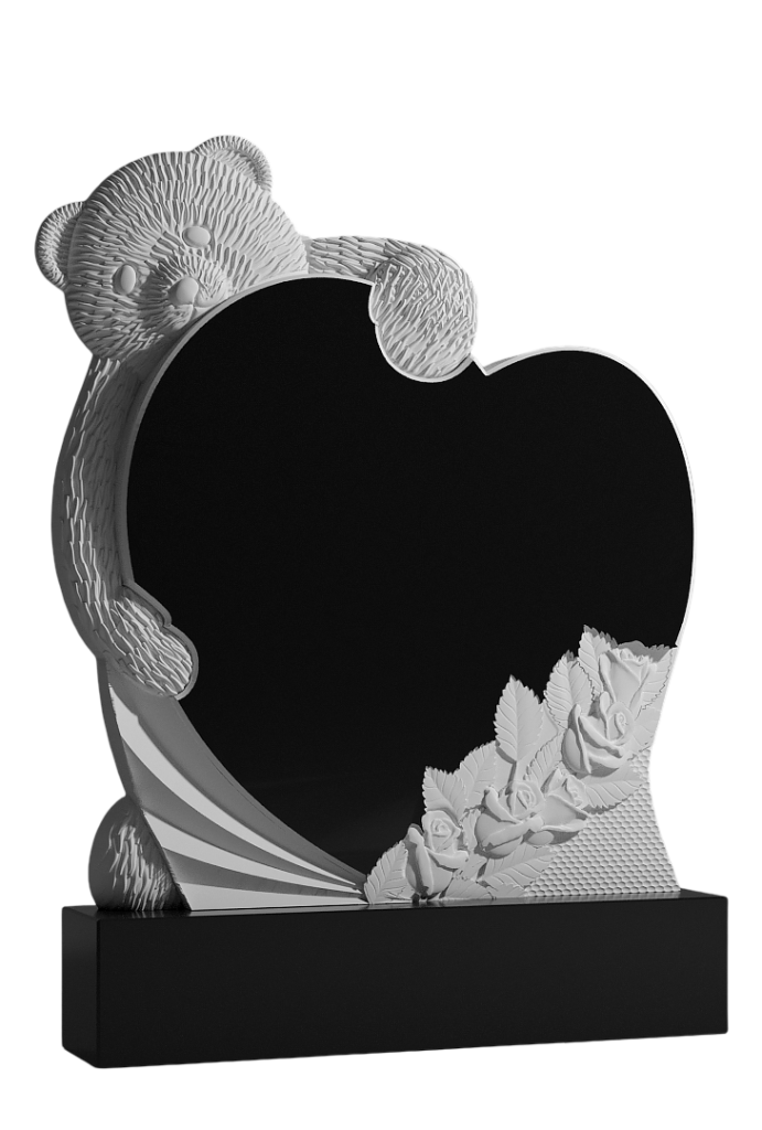 Этот памятник в форме сердца украшен у основания резными розами. Сзади его обнимает резной плюшевый мишка. Сердце — символ любви, розы — нежность и память, мишка — детская защита и верность. Детализация резьбы создаёт тёплый, трогательный образ. Памятник становится личным воплощением светлой памяти, особенно для прощания с ребёнком или самыми близкими. Он предлагает умиротворённое пространство для воспоминаний, где любовь навсегда сохранена в этом нежном союзе.
