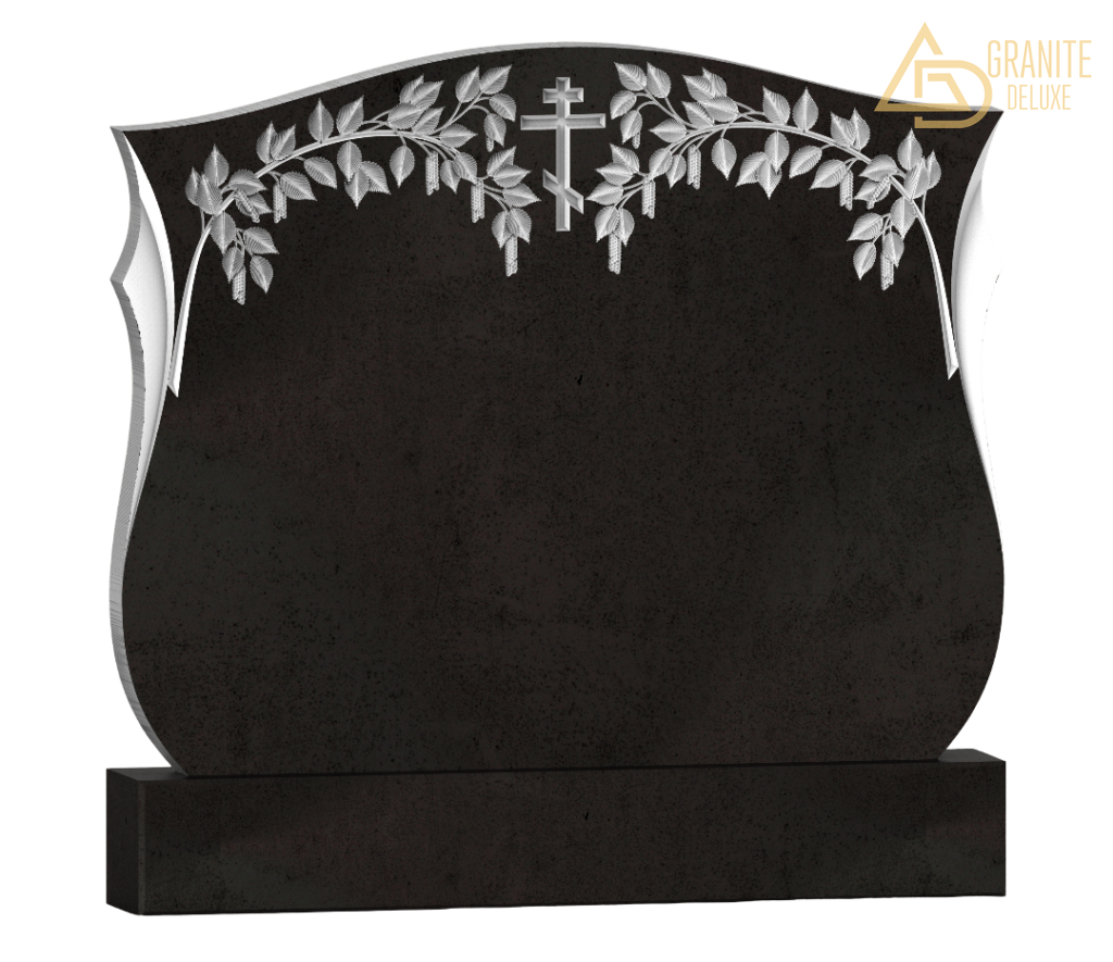 Монумент отличается широким, основательным силуэтом с плавными, волнообразными изгибами по краям, что создаёт ощущение спокойной, умиротворённой широты и мягкой, почти природной пластики. Верхнюю часть памятника обрамляют две ветви деревьев, отходящие от углов и изгибающиеся к центру. Их резные листья образуют лёгкую, ажурную сень. В пространстве между ними, в центре композиции, расположен строгий крест. Этот диалог элементов рождает целостный образ: природное обрамление символизирует жизнь, рост и покров памяти, в то время как крест олицетворяет духовный центр, веру и вечность. Лаконичность формы и ясность символики фокусируют внимание на гармонии между земным и небесным. Памятник создаёт пространство для глубокого созерцания, воплощая идею защиты, примирения и надежды, обретённых в тихом единстве природы и духа.