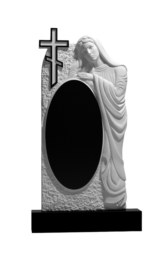 Данный памятник выполнен из камня, где центральный элемент — гладкая овальная вставка для портрета — контрастирует с фактурной, рустикальной поверхностью стелы. С правой стороны над ним склоняется объемная скульптура женщины в полный рост. Её поза и сложенные руки выражают тихую скорбь и заботу, а плавные линии одежды добавляют динамики. В верхнем левом углу расположен гладкий православный крест, создающий смысловой акцент. Единство матовой фактуры скульптуры и фона подчеркивает полированную центральную часть, формируя цельный, строгий и глубоко символичный образ вечной памяти и защиты.