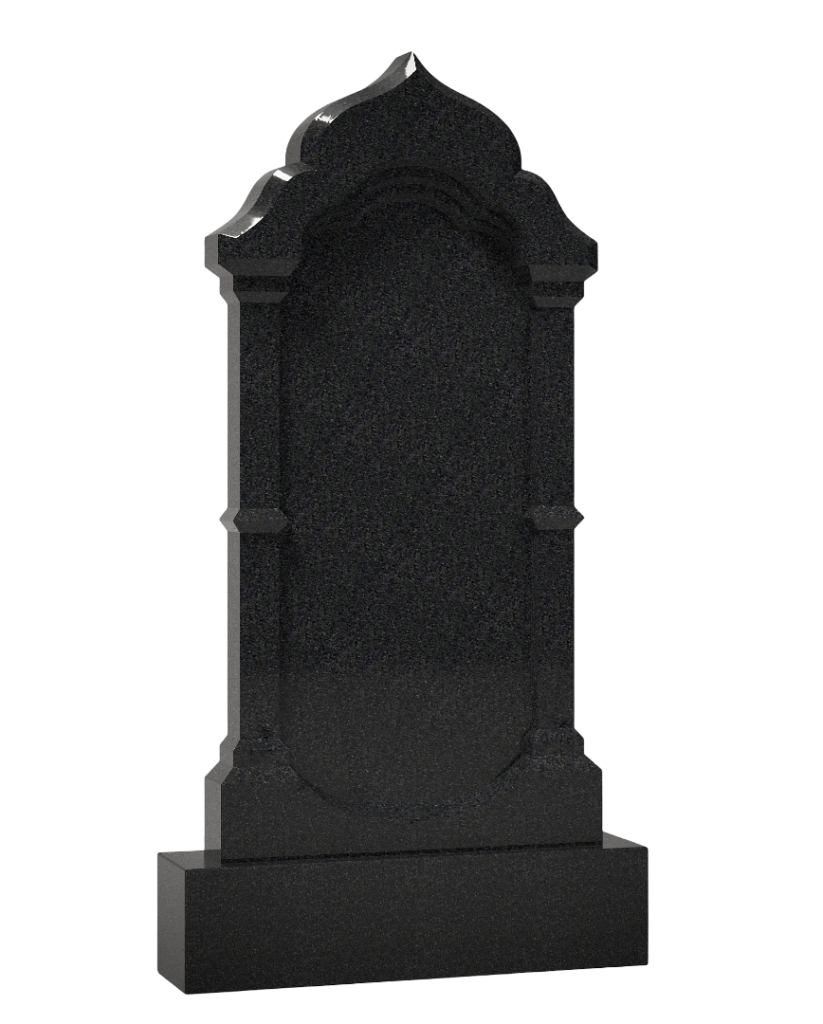 Вертикальный памятник архитектурной формы, напоминающий стрельчатую арку или свод храма. Сложный контур с фигурным верхом и внутренним арочным вырезом создает эффект глубокой ниши. Внутреннее пространство арки имеет контрастную, слегка шероховатую фактуру, визуально выделяя место для надписей. По бокам расположены стилизованные плоские колонны с капителями, поддерживающие свод. Памятник установлен на строгое прямоугольное основание, обеспечивающее устойчивость. Этот дизайн, сочетающий классические архитектурные формы и символику священного пространства, создает монументальное и сдержанное место для вечной памяти.
