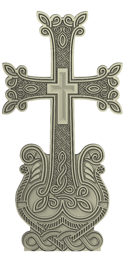 Этот вертикальный памятник, выполненный в виде креста, богато украшенного резными завитками и орнаментами, является воплощением памяти, обращённой к небу. Сложная, филигранная резьба, покрывающая его поверхность, подобна узору жизни — переплетению радостей, печалей и любви, оставленной ушедшим. Каждый завиток напоминает о неразрывной связи, о дорогих чертах и моментах, навечно запечатлённых в сердце. Крест, как символ веры и вечного покоя, возвышается среди этого каменного кружева, говоря о надежде, которая освещает путь даже в час deepest скорби. Этот монумент — не просто форма, а место для тихой беседы с тем, кого нет рядом, где горечь утраты смягчается красотой воспоминаний и смиренной уверенностью в том, что любовь — вечна.